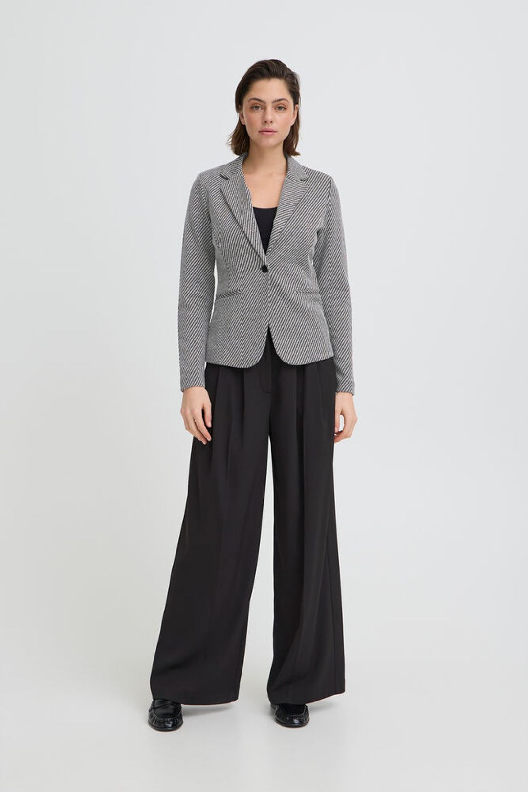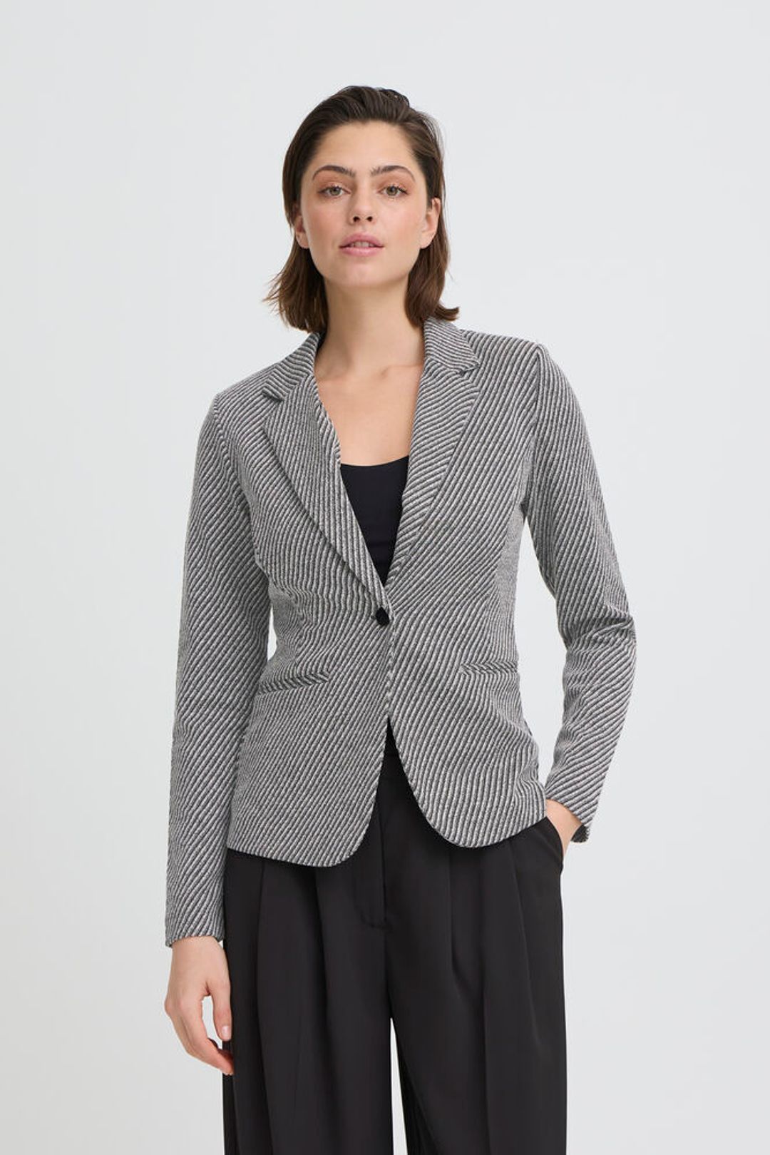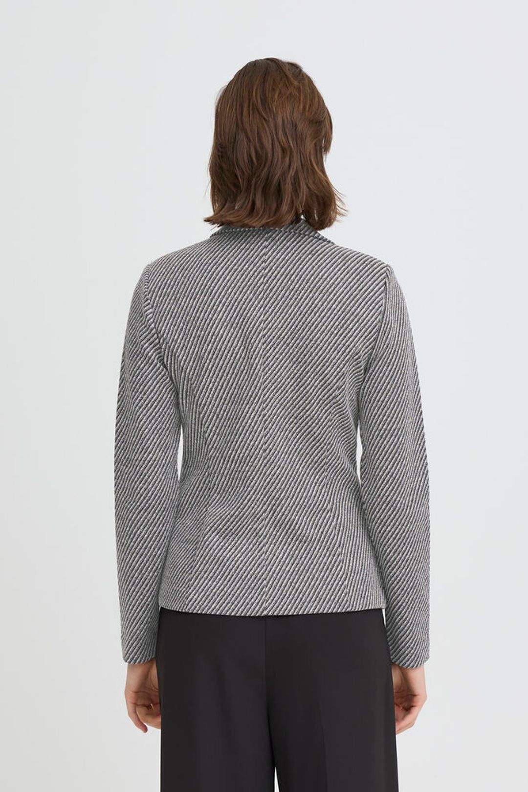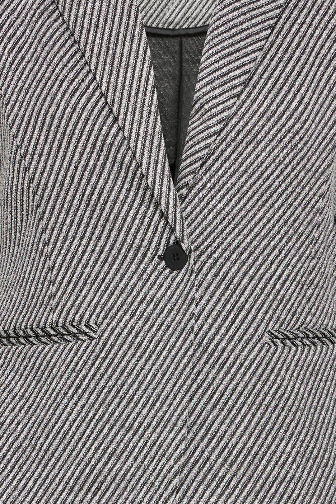 Su estampado de rayitas finas en diagonal, mezclando gris y negro, crea un efecto visual precioso que estiliza y eleva cualquier look al instante. Es de esas piezas que te pones y, sin darte cuenta, ya vas más arreglada.