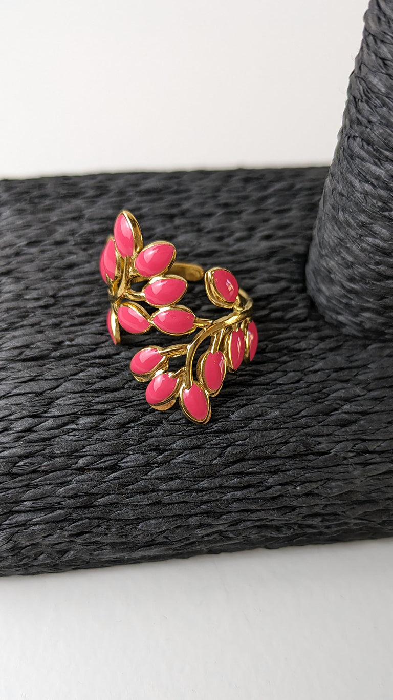 El anillo no es de un solo color; está bañado en tonos dorados y otros colores vivos, proporcionando un contraste hermoso y dinámico.