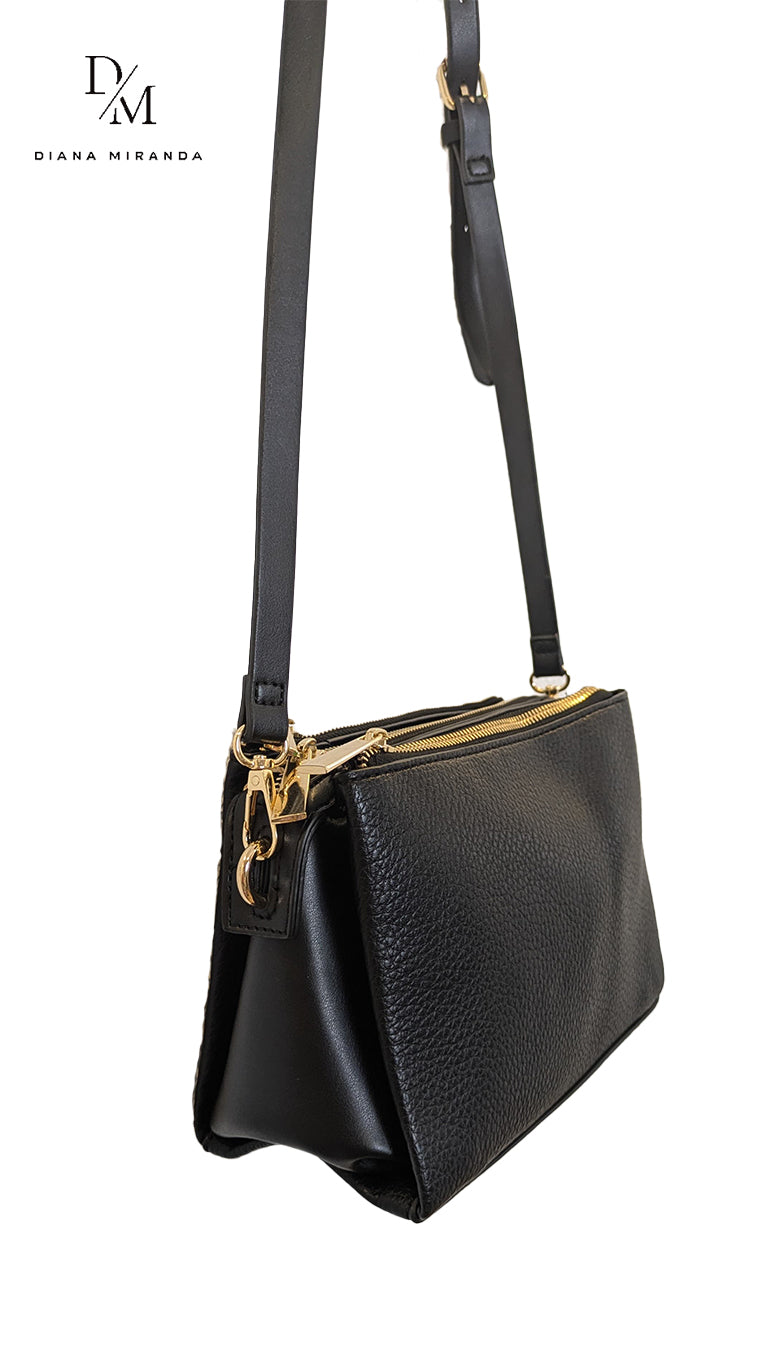 La bandolera en color negro, Alaraz destaca por su elegancia discreta y funcionalidad. Fabricada con un diseño moderno y versátil, cuenta con tres compartimentos independientes, cada uno asegurado con una cremallera de suave gradual que mantiene tus pertenencias seguras y organizadas. Su asa, confeccionada en el mismo tono delicado, aporta uniformidad al conjunto y se adapta cómodamente al hombro o al cuerpo cruzado. Pero lo que realmente la convierte en un accesorio práctico es la posibilidad de intercambiar el asa. Gracias a su ingenioso sistema de enganche desmontable, puedes reemplazarla fácilmente por otra correa, permitiéndote personalizar tu estilo en segundos y adaptarte a cualquier ocasión. La bandolera combina a la perfección la estética moderna y la funcionalidad, ideal para acompañarte en tu día a día o para una escapada nocturna.