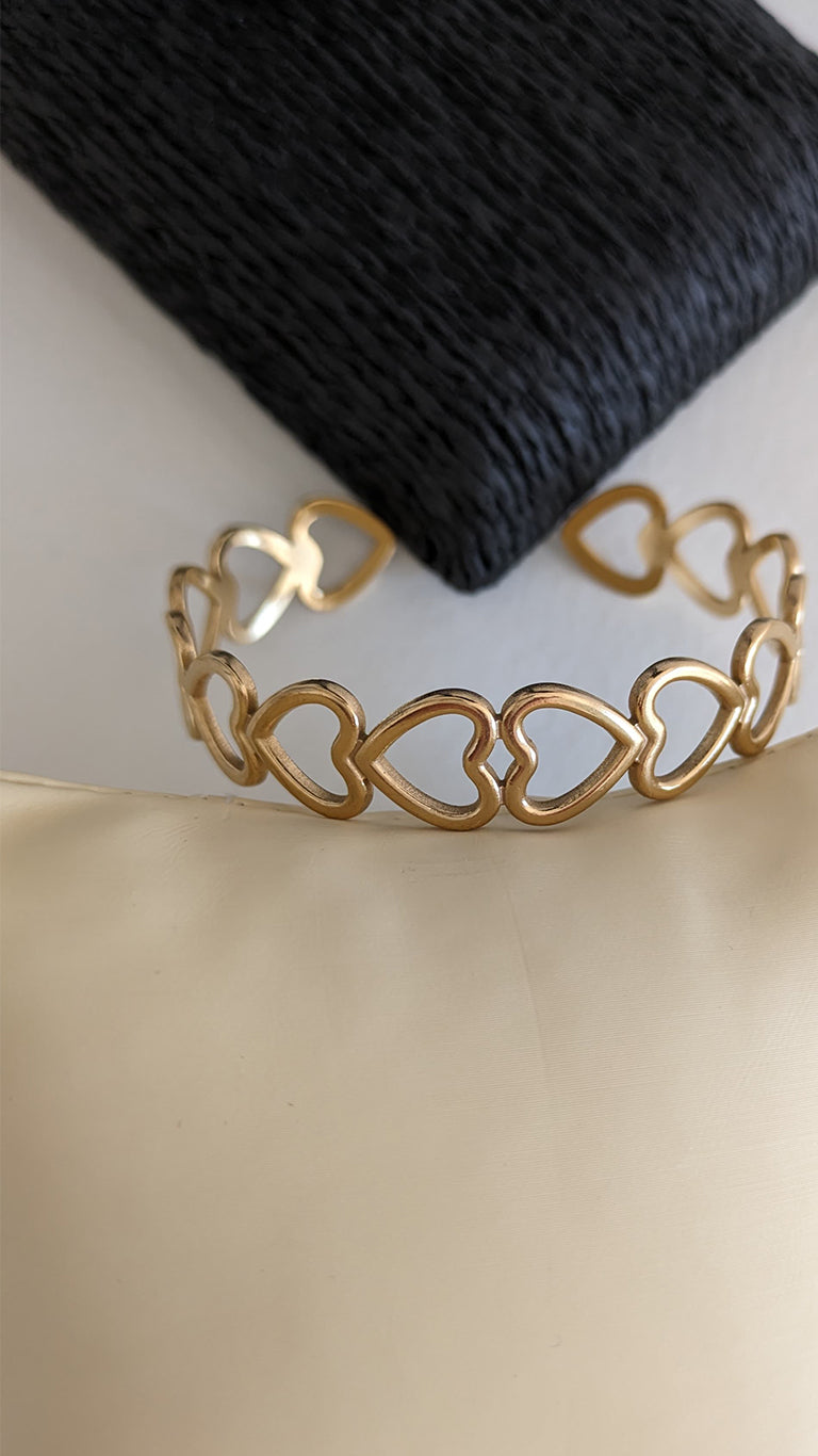 El brazalete CORAS, captura la esencia del amor y la elegancia en un diseño sencillo pero cautivador. Este brazalete dorado con corazones es una pieza que no solo adorna tu muñeca, sino que también lleva consigo un mensaje de amor y cariño. Está elaborado en acero inoxidable, con un acabado dorado que le da un aspecto lujoso y duradero. Su diseño principal consiste en una serie de corazones interconectados, cada uno meticulosamente detallado para resaltar su forma y brillo.