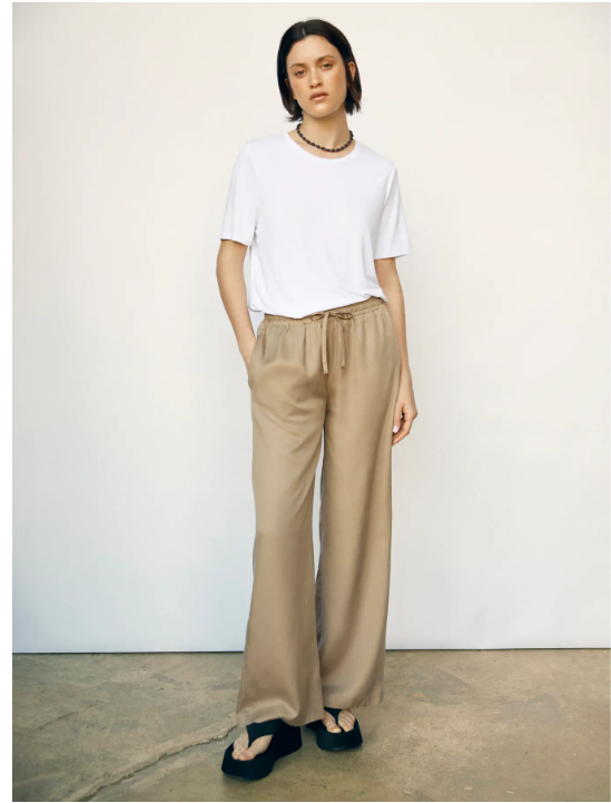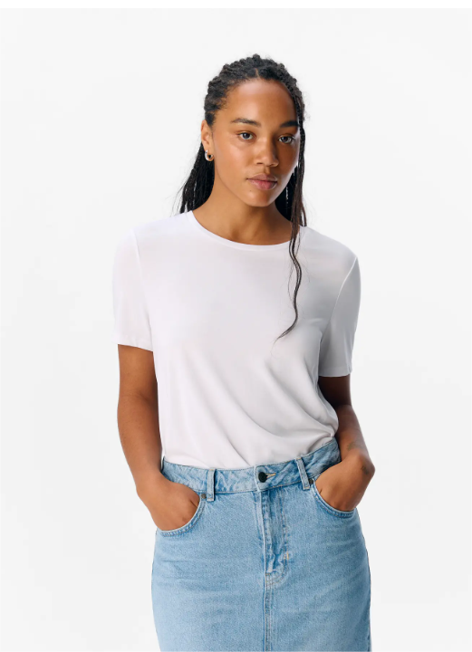 Cuando se trata de básicos, esta camiseta fluida es simplemente irresistible. Confeccionada en una mezcla de 65% Modal TENCEL™ y 35% poliéster, ofrece un tacto increíblemente suave y una caída espectacular que realza cualquier silueta con un aire natural y desenfadado.