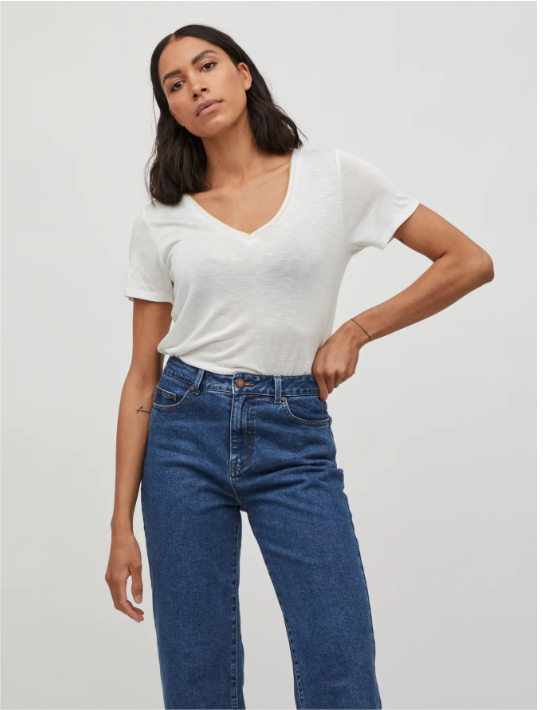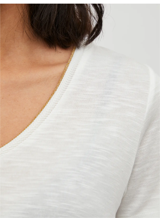 Su tejido es suave, gustoso, con esa caída ligera que se siente bien desde el primer momento 💫. La manga corta la hace versátil, y el escote en pico, elegante y favorecedor. Pero el detalle estrella —ese que la convierte en una joya del armario— es su ribete dorado que recorre todo el escote ✨💛. Un toque luminoso, delicado, que eleva cualquier look al instante.
