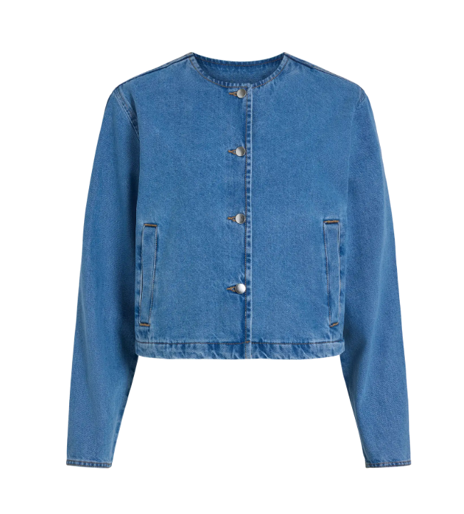 Olvidate de lo típico. Esta chaqueta vaquera de VILA llega para darle una vuelta de tuerca a tu armario con un diseño que se sale de lo común: sin cuello, con líneas limpias y una silueta moderna que atrapa todas las miradas.
