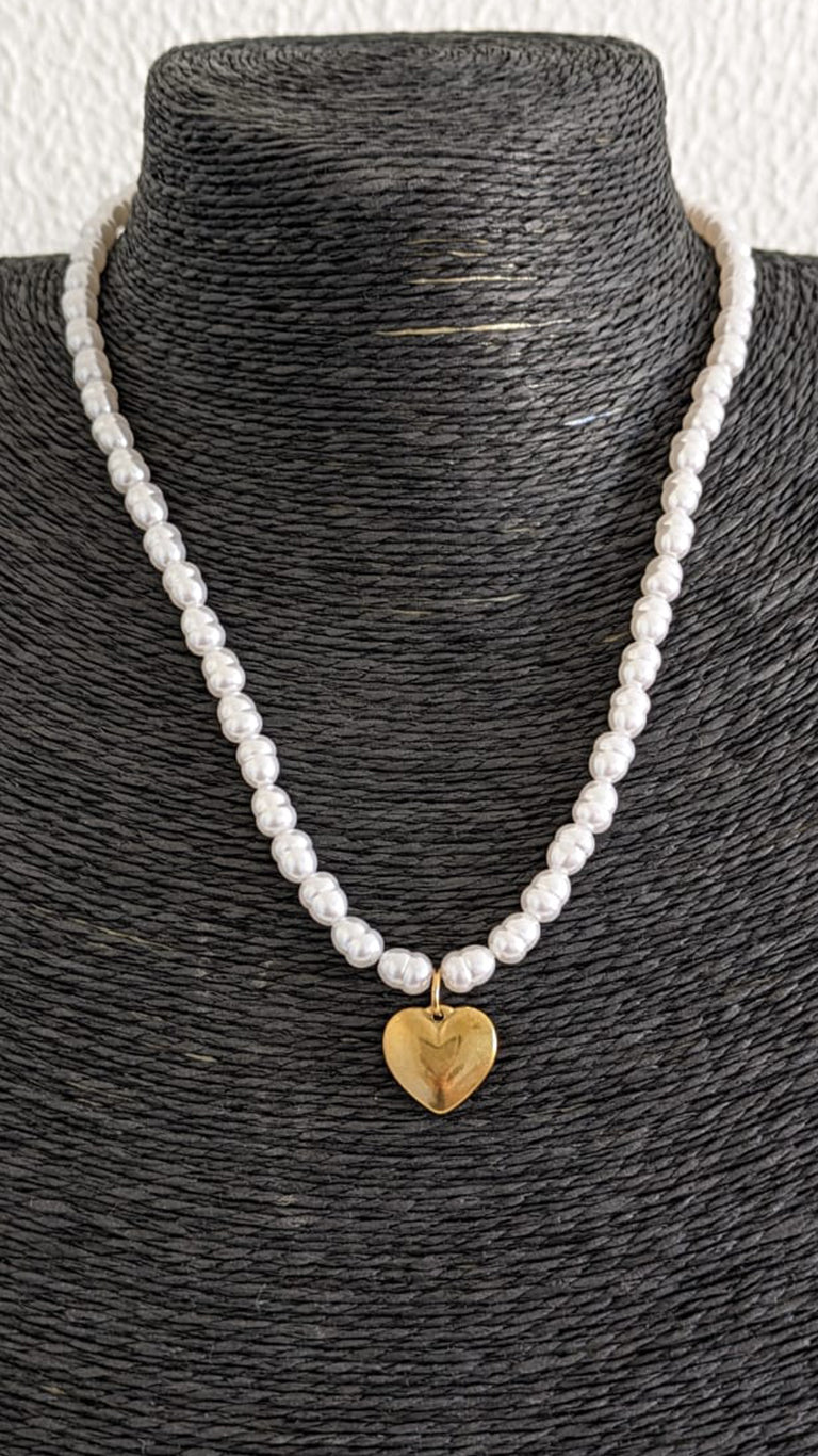 Preciosa gargantilla de perlas blancas artificiales, el diseño se completa con un encantador dije de medalla en forma de corazón en acero inoxidable.