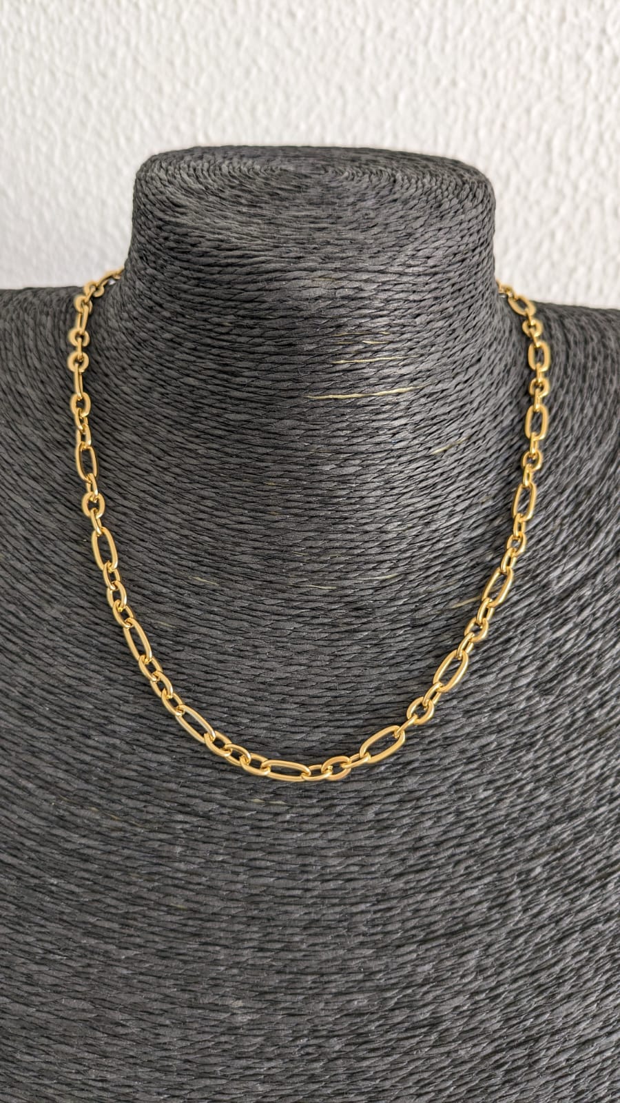 Este elegante collar está confeccionado en acero inoxidable dorado, ofreciendo una durabilidad excepcional y un brillo duradero. Cierre ajustable con extensión.