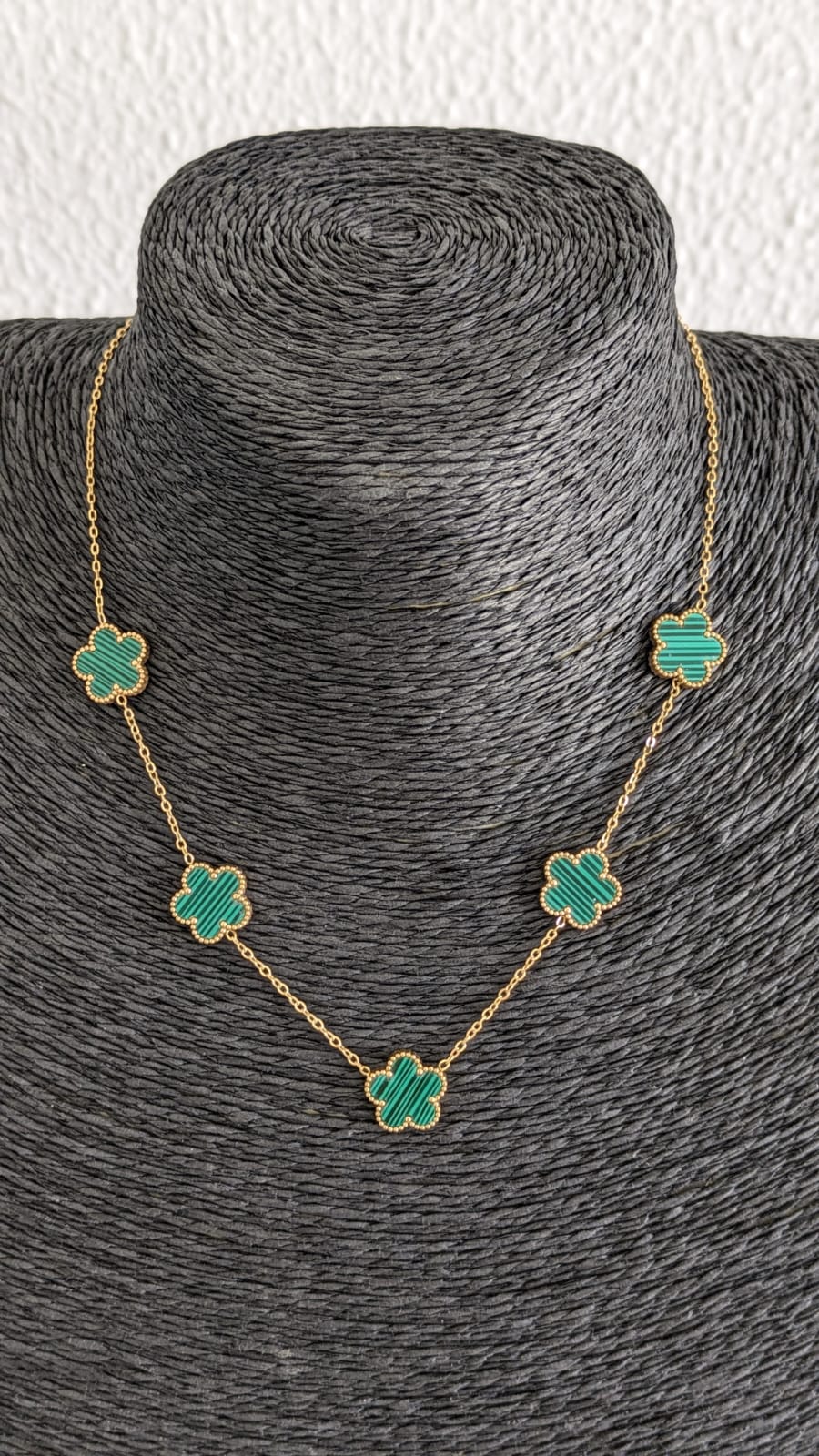 Este encantador collar es una pieza única realizada en acero inoxidable de alta calidad. Cuenta con cinco delicados tréboles nacarados, simbolizando la buena suerte y la prosperidad. El cierre del collar es ajustable e incluye una extensión, permitiendo adaptarlo perfectamente a tu estilo y comodidad.