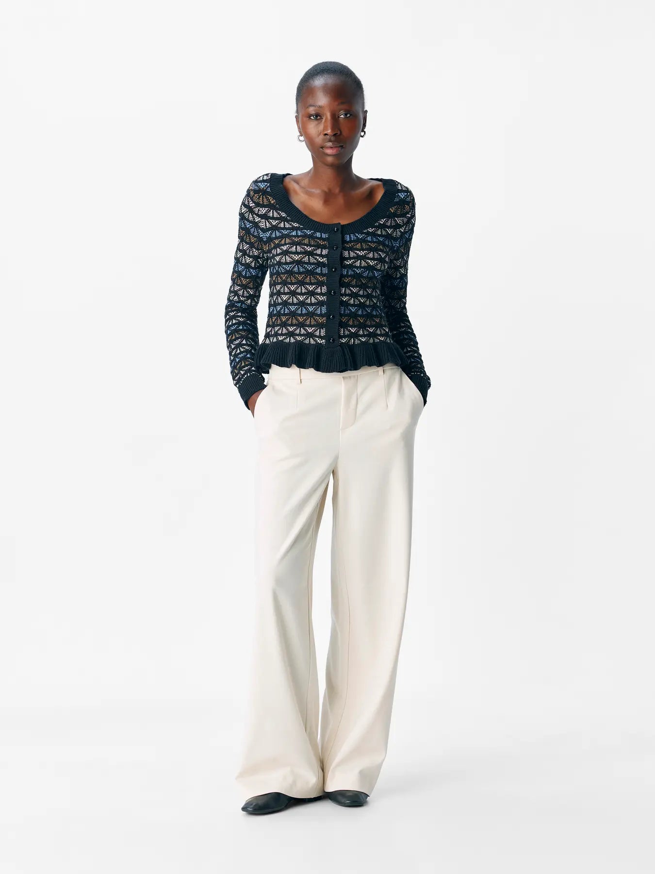El cardigan corto a juego de .OBJECT es el complemento perfecto para completar el look, aunque también brilla por sí solo. Mantiene el mismo estampado sobre fondo negro, con detalles en marrón, crudo y azul cielo, creando una continuidad elegante cuando se combina con la falda.