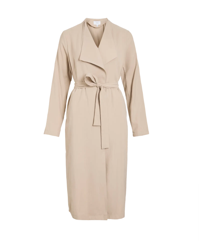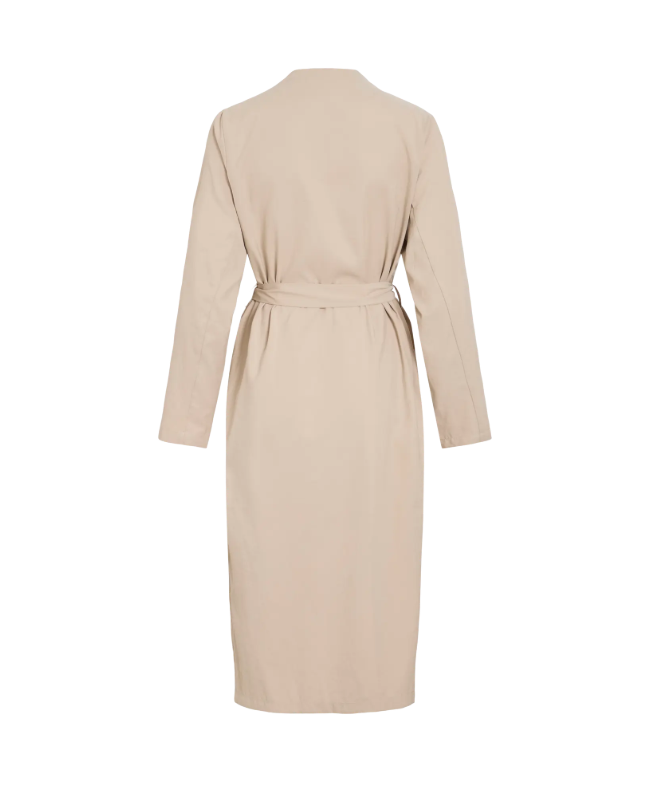 Su cuello de solapas clásicas le da un aire sofisticado, mientras el cinturón te permite ajustarla a tu manera 👗 —entallada y poderosa, o suelta y con flow. El largo perfecto alarga la figura y la tela, ligera y consciente, te acompaña sin agobiar.