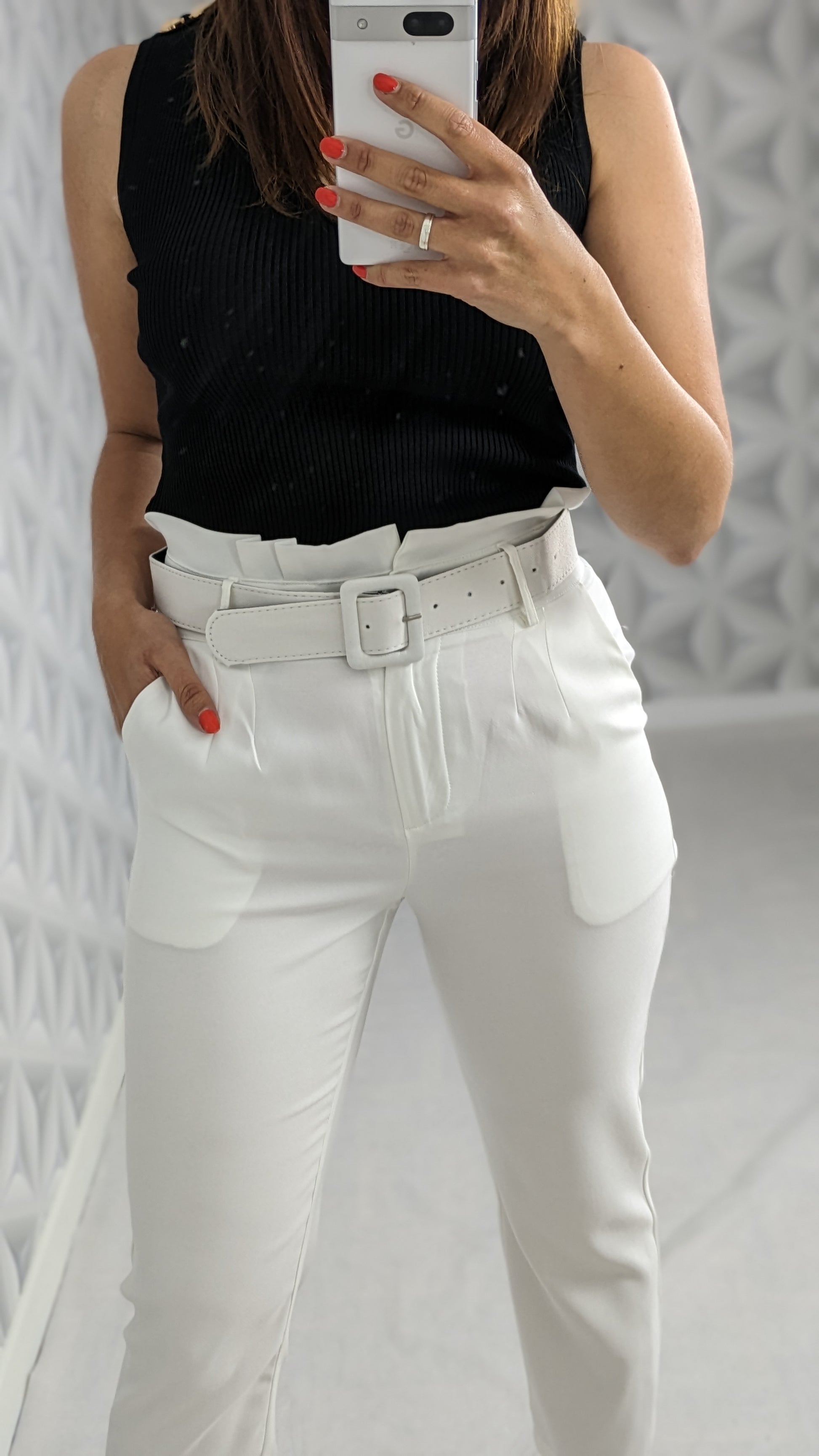 Nuestro pantalón ESTI con el cinturón incluido ha sido diseñado en un blanco puro, de corte recto y tiro alto, con un tejido 100% de poliéster de tacto sedoso y caída fluida, cómodo y fresco, es ideal para ocasiones formales y semi-formales.