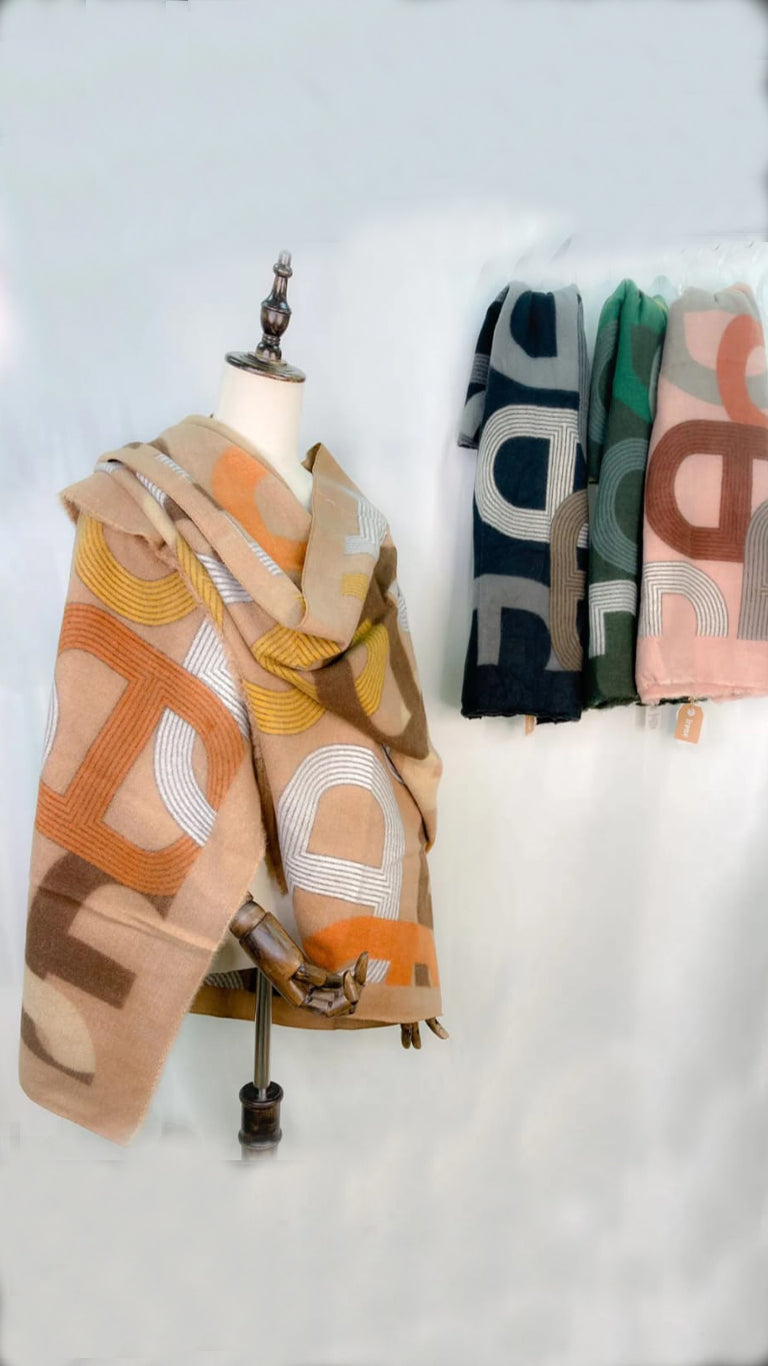 Pañuelo fabricado en un 80% de viscosa y un 20% de lana de muy buena calidad. Este pañuelo tiene un fondo en negro, combinando formas en color gris, marrón y crudo.