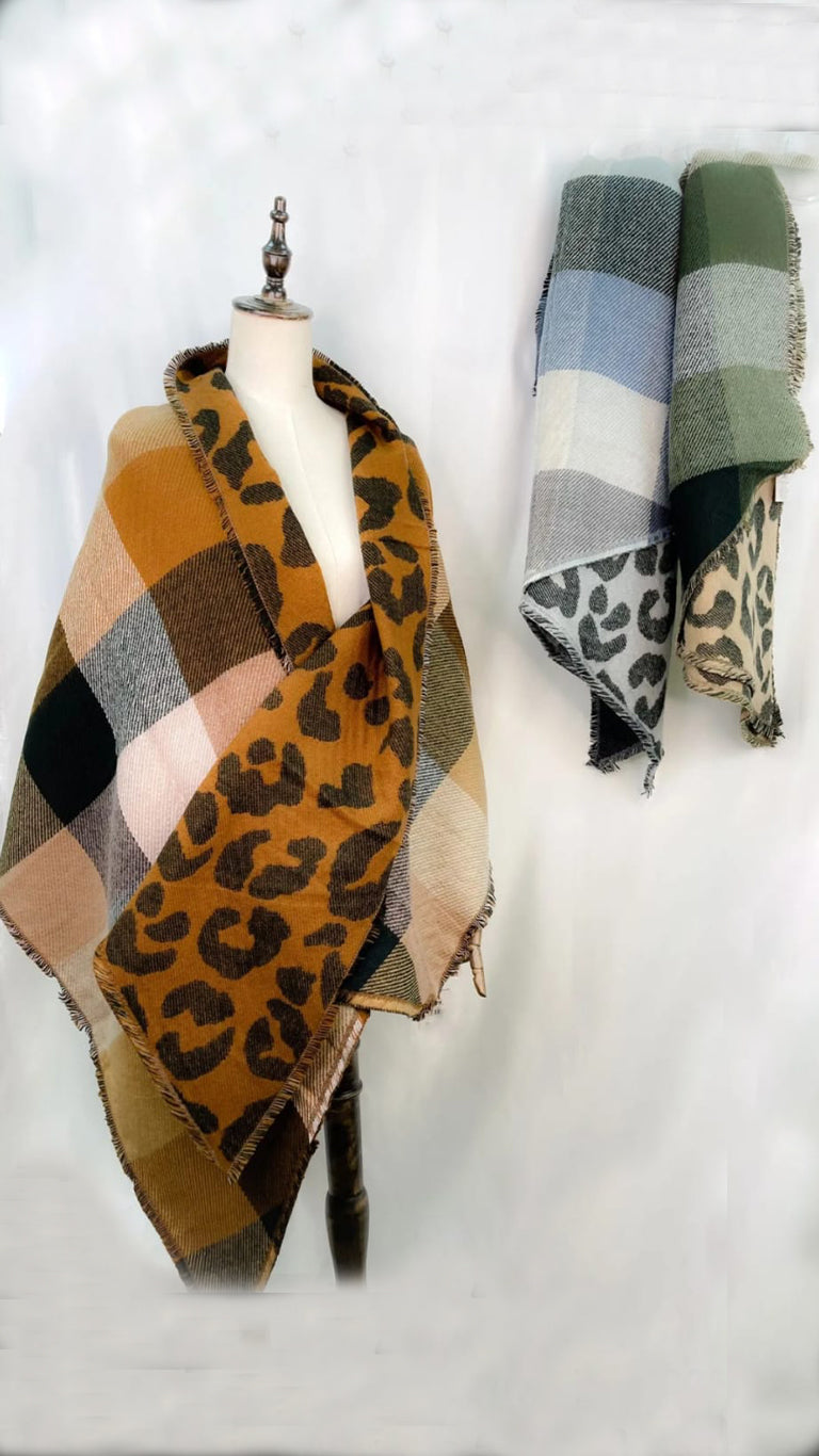 Pañuelo fabricado en 100% acrylic, de muy buena calidad. Este pañuelo tiene 2 estampados diferentes. Por un lado tiene cuadros combinando colores como el marrón, camel, negro y crudo y por el otro tiene un estampado en animal print en marrón chocolate y negro.