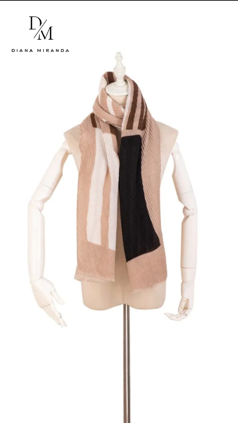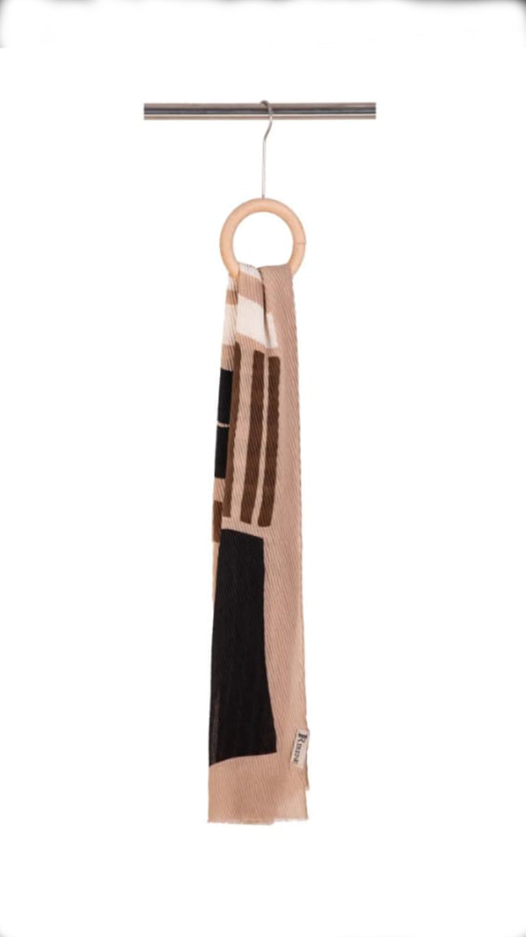 Pañuelo fabricado en 30% de algodón y 70% viscosa, de muy buena calidad, con fondo en beis combinado con negro, marrón chocolate y crudo. El pañuelo tiene un efecto arrugado.