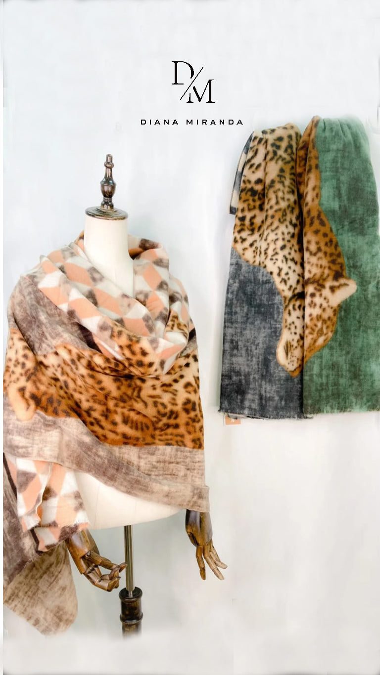 Pañuelo fabricado en un 80% de viscosa y 20% de lana, de muy buena calidad. Este pañuelo tiene un fondo gris, combinado con marrón, crudo y negro.