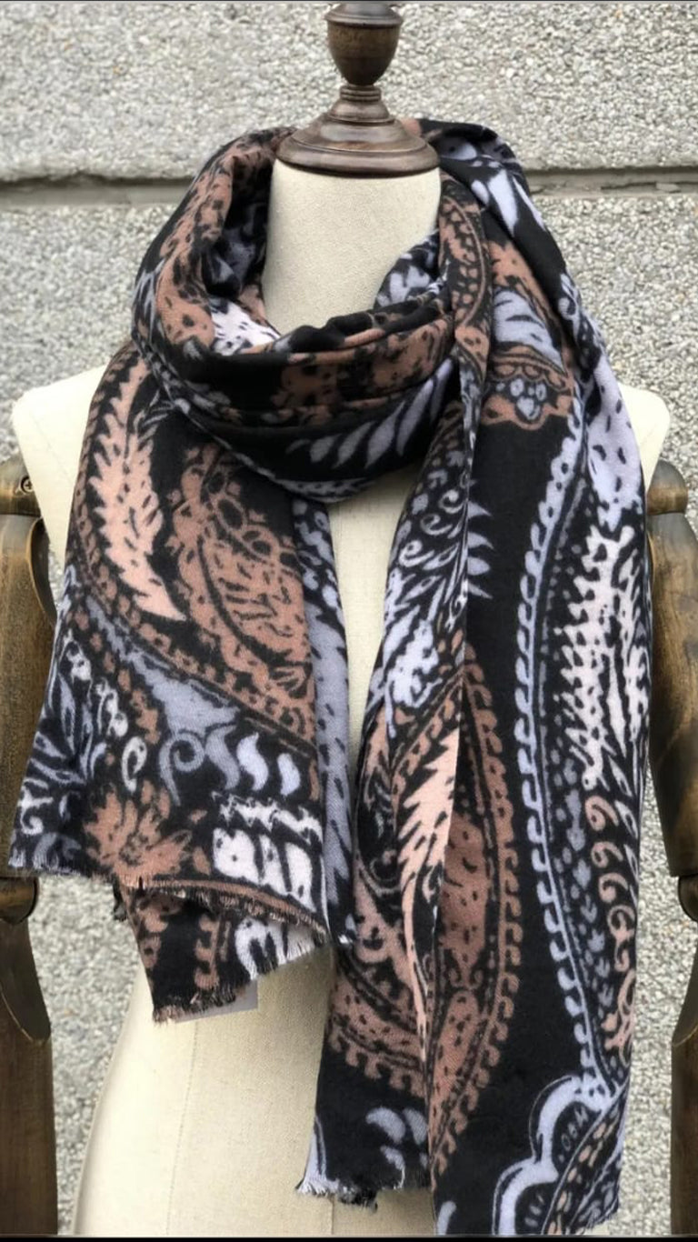 Pañuelo fabricado en 100% viscosa, de muy buena calidad. Este pañuelo tiene de fondo el color negro, combinando tonos en gris y en marrón.
