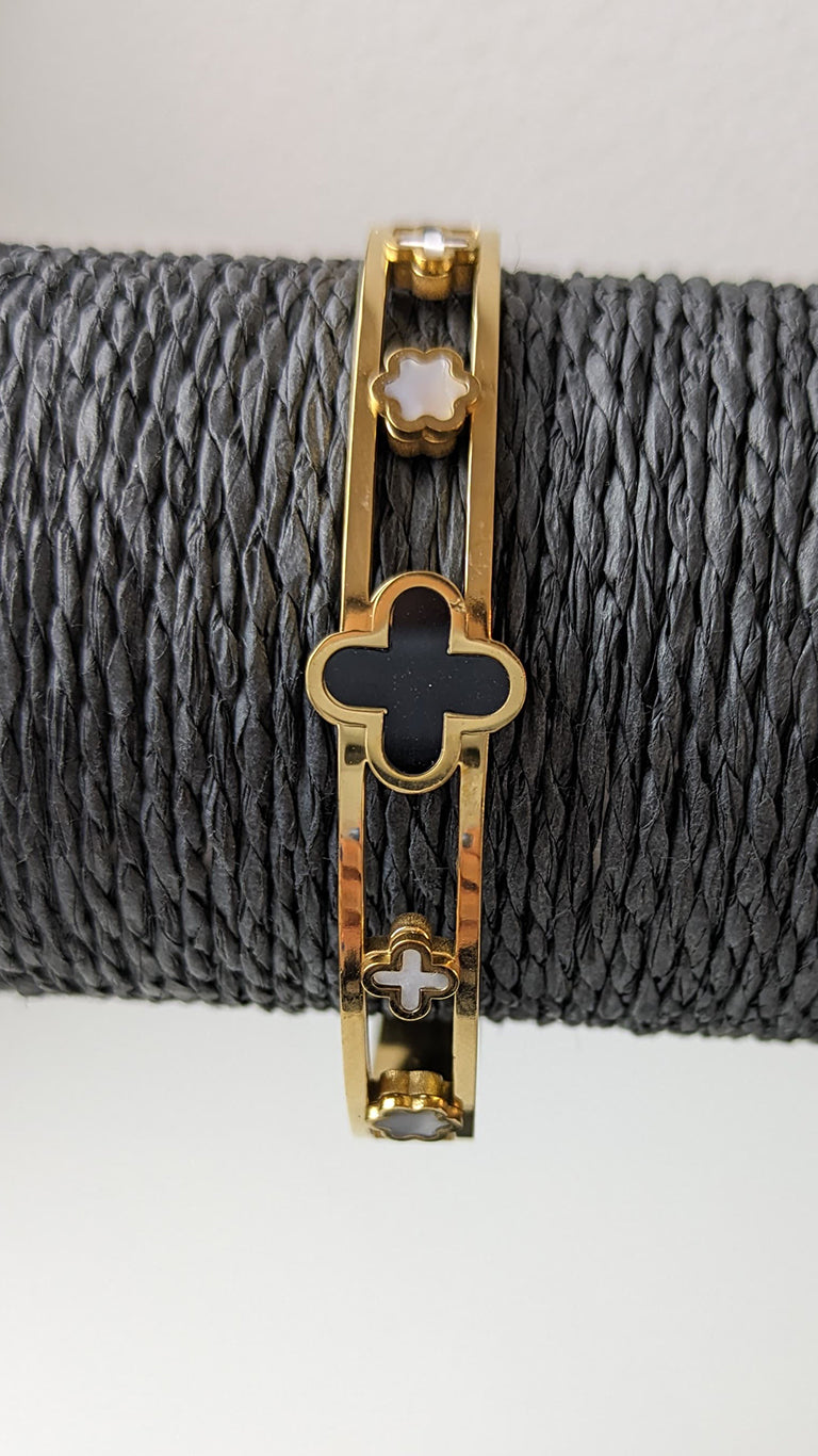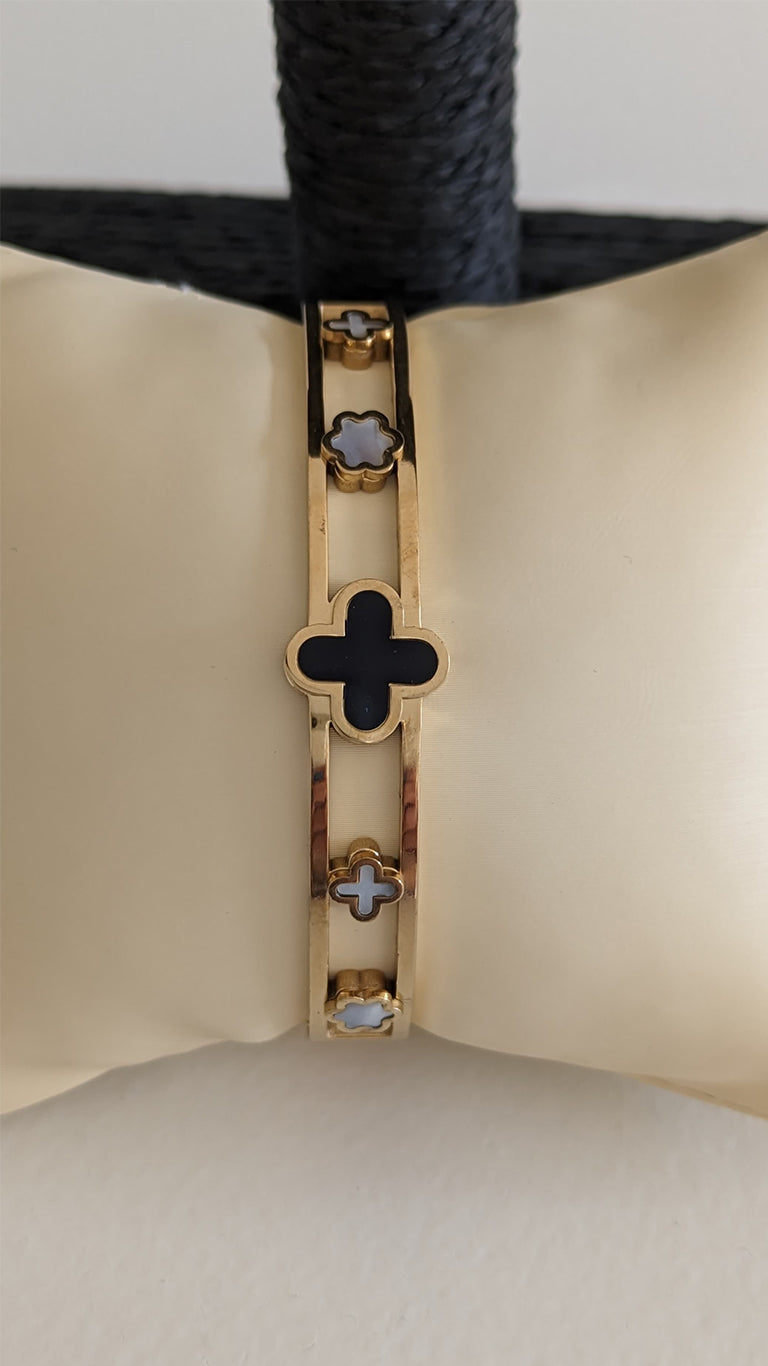 La pulsera CROSS, combina la elegancia del dorado con la profundidad del negro y el brillo del blanco, creando una pieza que es tanto moderna como significativa. Esta pulsera, con su diseño detallado y su cierre de seguridad, es un accesorio que no solo complementa tu estilo, sino que también lleva consigo un simbolismo poderoso. Está elaborada en acero inoxidable, recubierta con un acabado dorado que le confiere un aspecto lujoso y duradero. En el centro de la pulsera, destaca una cruz negra, rodeada por cruces y estrellas más pequeñas en blanco marfil, creando un contraste visual impresionante.